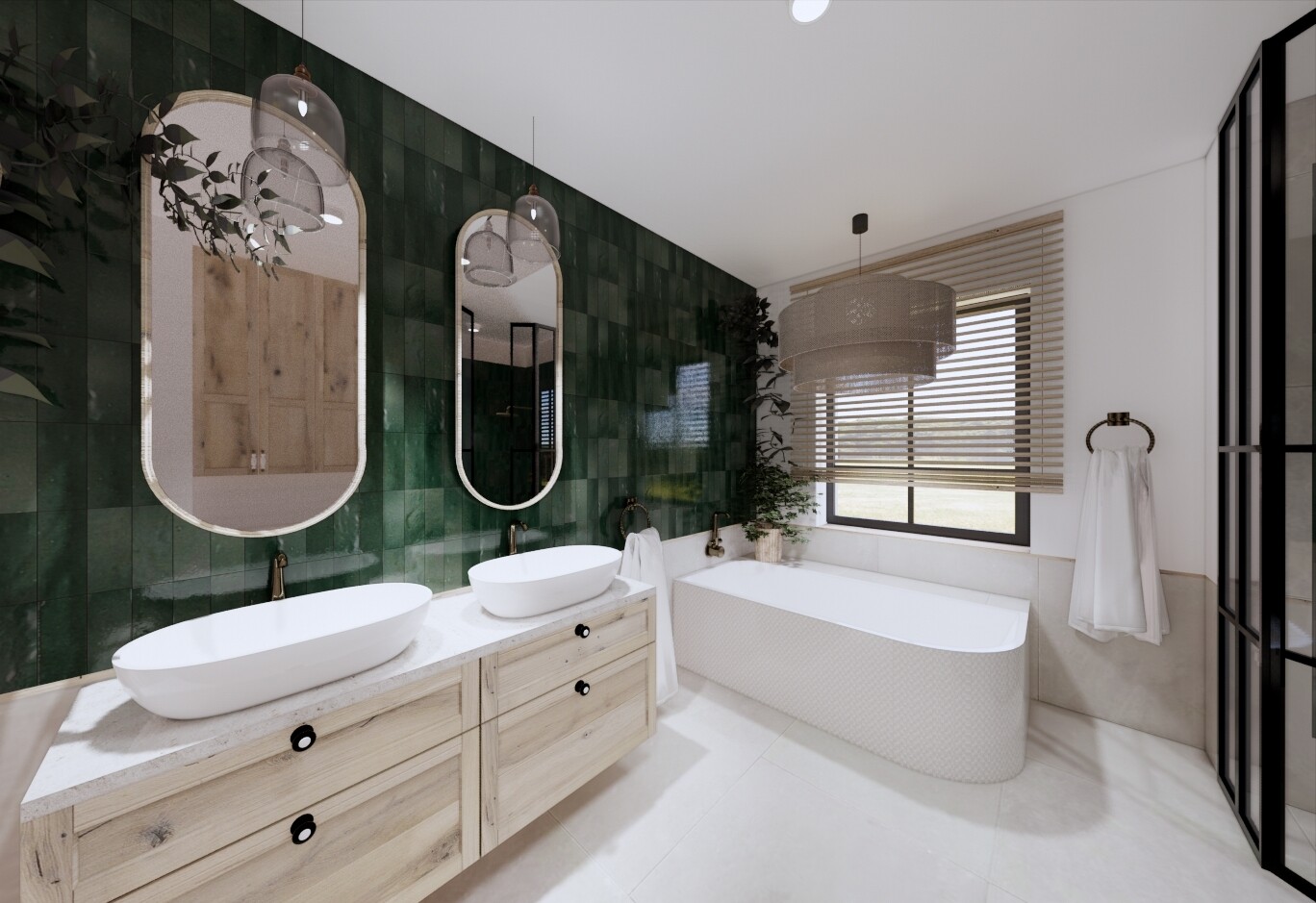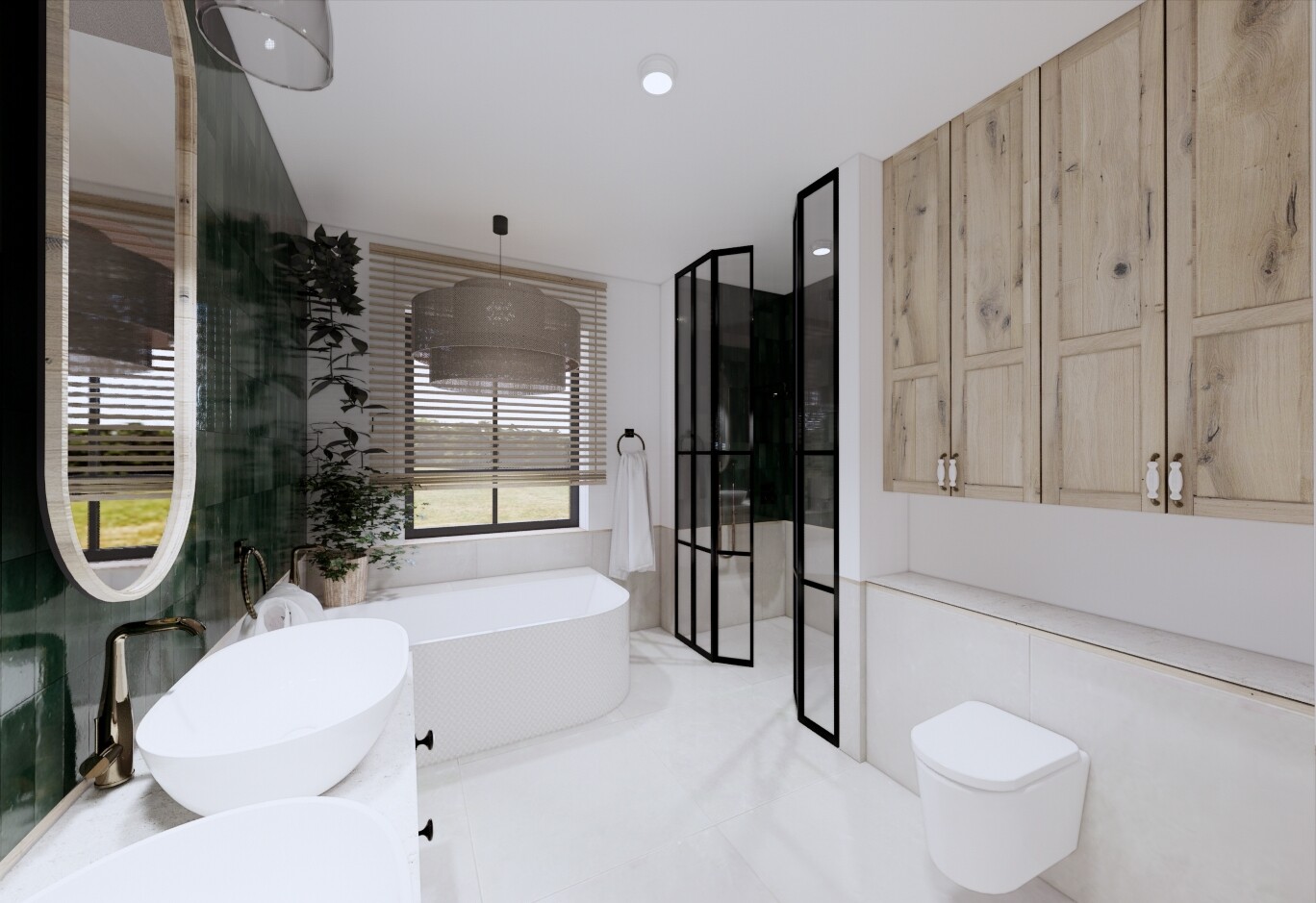 W domu jedynym miejscem o mocniejszym charakterze będzie łazienka z ciemnymi płytkami, która stylem pasuje do całości wnętrz.