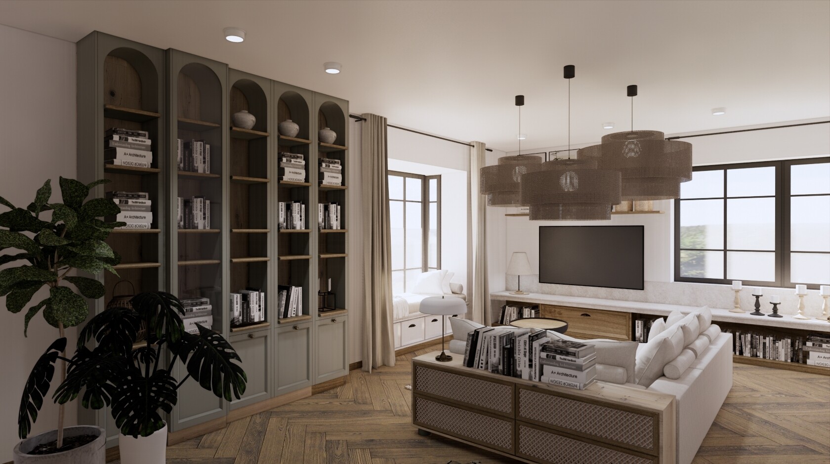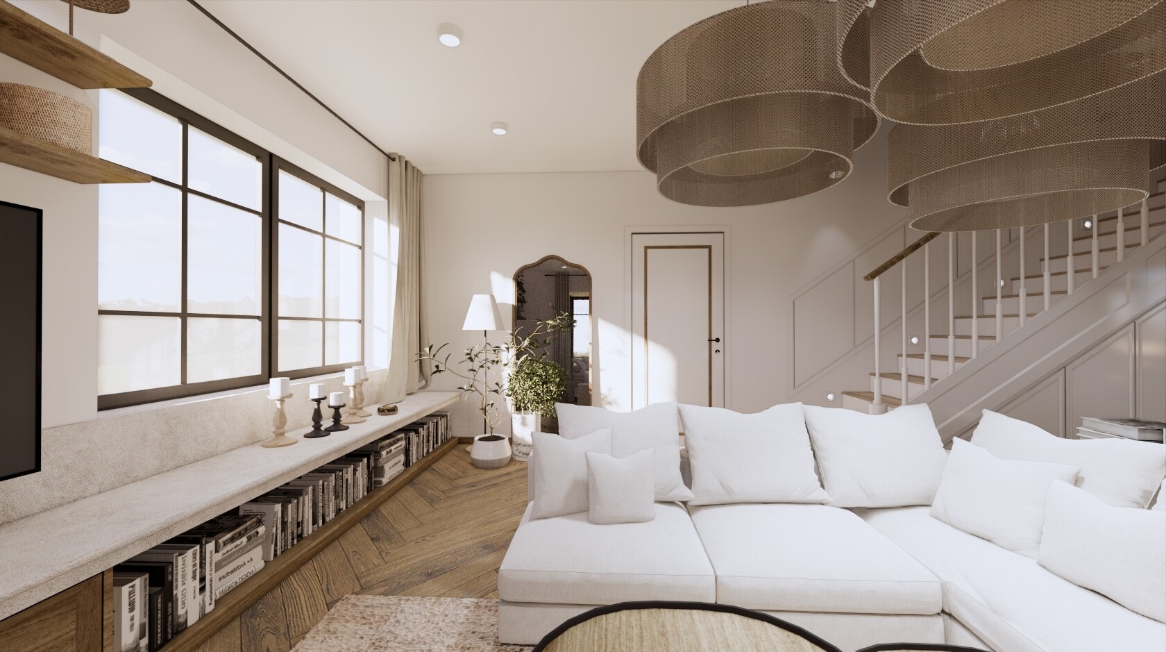 Po drugiej stronie za przegrodą z drewna salon z ogromną sofą i siedziskiem w oknie, które zachęca do czytania albo do tego żeby po prostu nie robić nic, po całym dniu pracy.