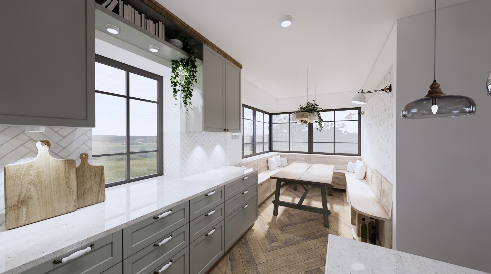 Kamienny blat w kuchni uzupełniony jest szafkami w kolorze z pogranicza zieleni i błękitu. W głębi ogromna ława, w której można schować planszówki albo koc.