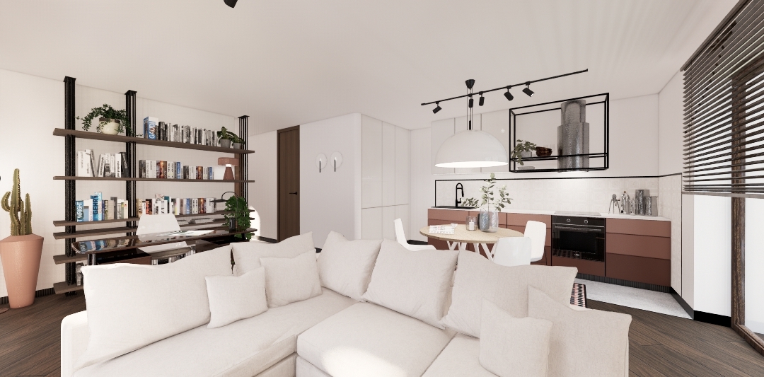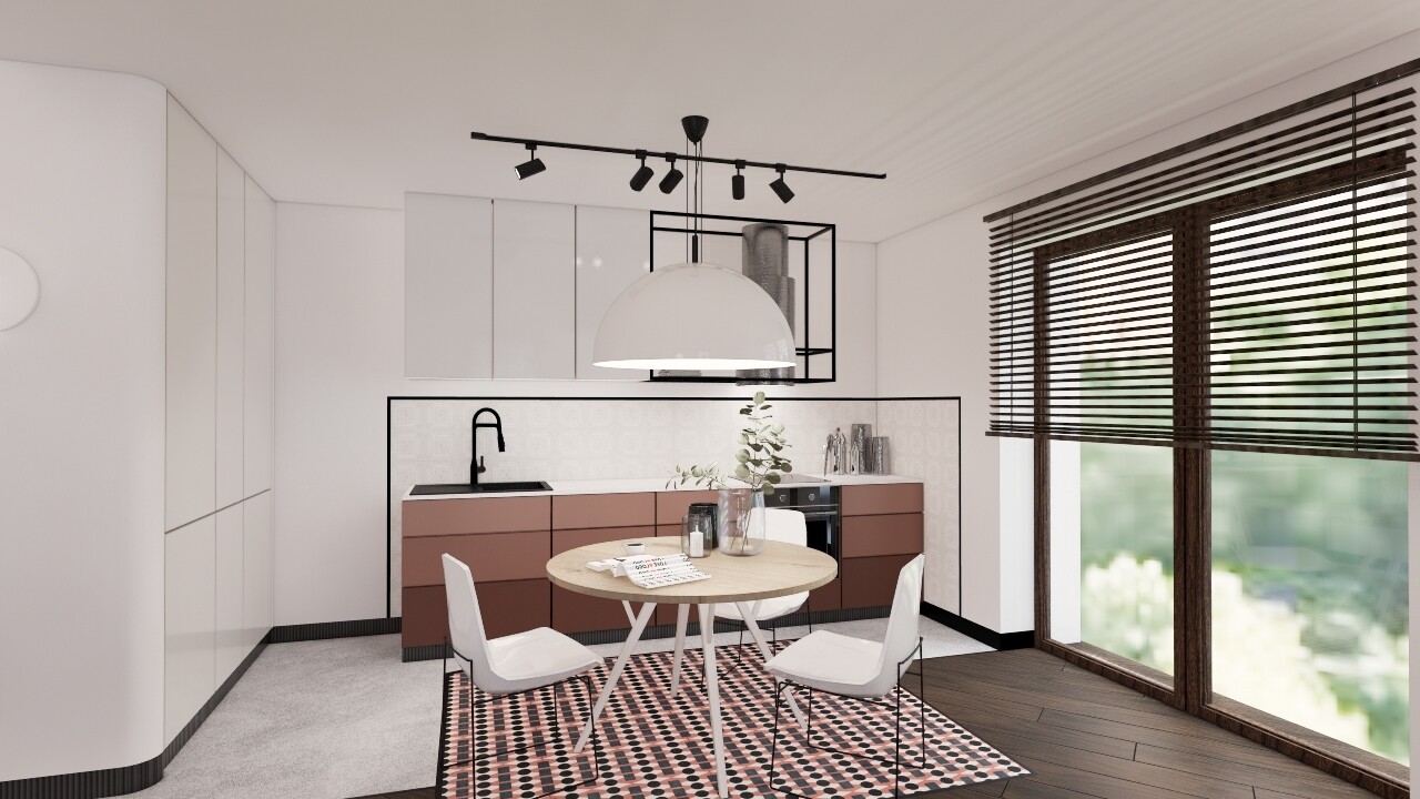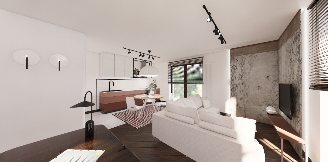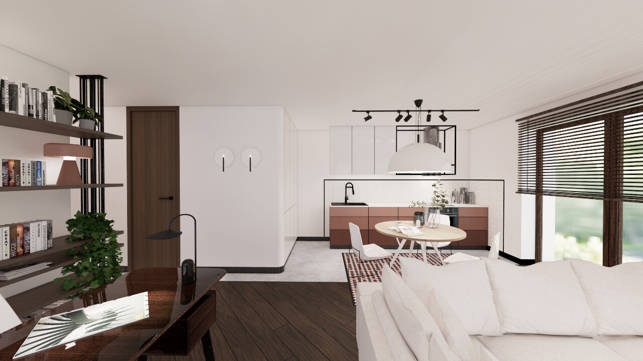 Miejsce do pracy z widokiem na kuchnię i salon. Płytki zbliżone odcieniem i charakterem do faktury betonu są połączone z innymi wzorami i pojawiają się w całym wnętrzu. W zabudowie kuchennej oprócz lodówki schowana pralka. Fronty kuchenne z przejściem tonalnym. Uchwyty czarne schowane w froncie