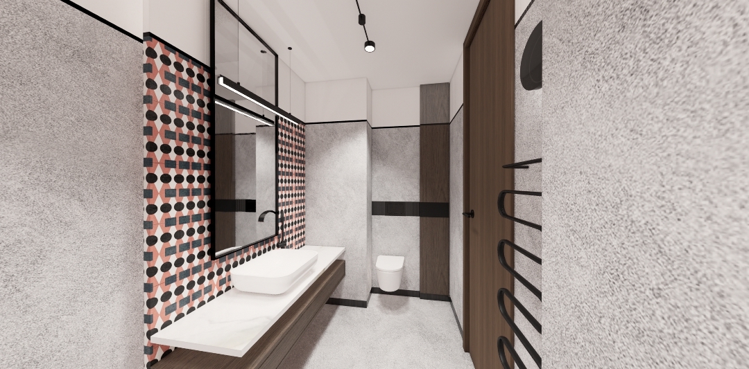 W łazience przycisk wkomponowany w zabudowę meblową tak żeby nie był widoczny. Po prawej stronie geberitu szafa w komponowana w całość wnętrza.
